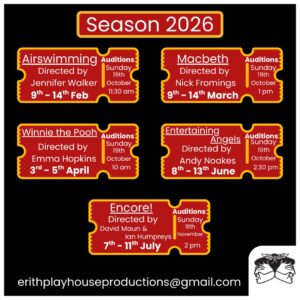 Erith Playhouse announced its next season of shows on Tuesday 30th September 2025. Auditions, along with an Open Day, will take place at the theatre on Sunday 19th October. Click on the poster for full season and audition details!